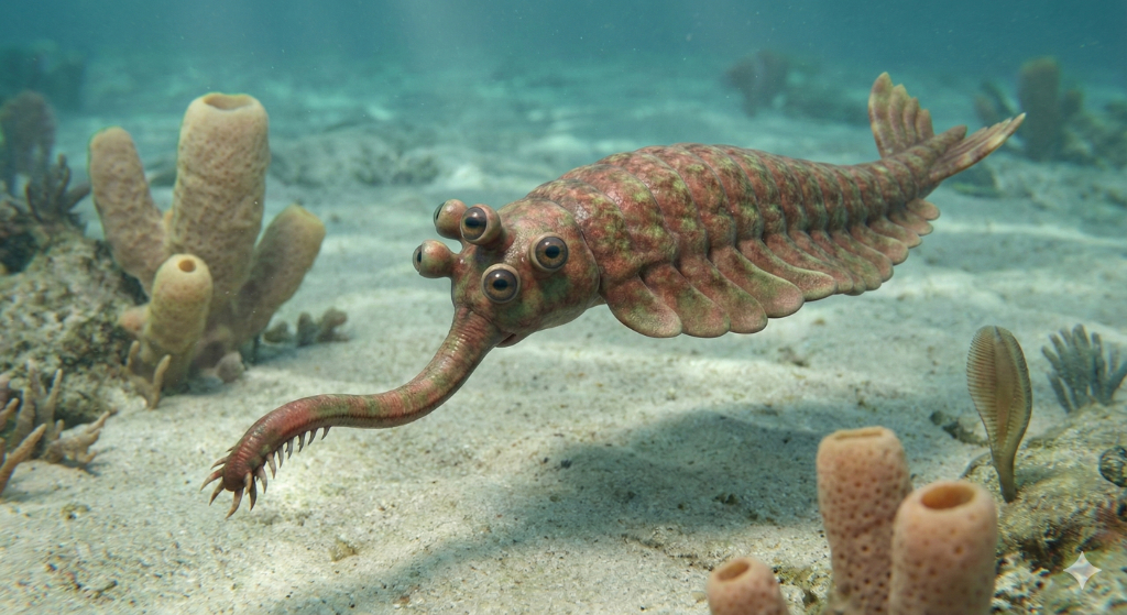 名前であるオパビニアとは「岩のもの」を意味し、トンボの幼虫であるヤゴが口を伸ばした時のように頭部の先に獲物を捕まえる為の長い突起を持っています。また、多くの生物が目は2つである事に対してオパビニアは目が5つもある事も大きな特徴となっています。